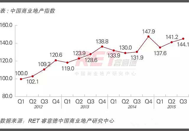 2015年第三季度,中國商業地產指數(CCI)144.1,上升2.9點,環比上漲2.0%,同比上漲9.3%,整體平穩上升。