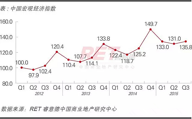 2015年第三季度,中國商用物業指數(CRI)為110.1,環比持平,同比下跌0.8%。第三季度商業營業用房投資占比繼續上升,而大量新項目入市,導致平均租金下滑,空置率上升,預計消化期將持續0.5-1年時間。