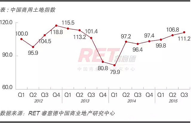 2015年第三季度,中國商用土地指數(CLI)為111.2,上升4.4點, 環比上漲4.1%,同比上漲15.4%。商用土地成交占比再創新高,達到41.6%,推動第三季度指數繼續上揚。
