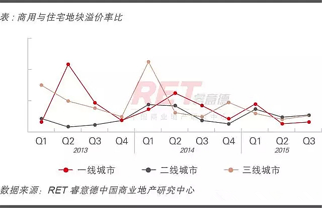 商用土地郊區分布比重近七成,促使商用土地與住宅土地的樓板價比值繼續回落;商用土地與住宅土地的成交溢價比與上季度基本持平,商用土地成交溢價率保持平穩,以底價成交為主。