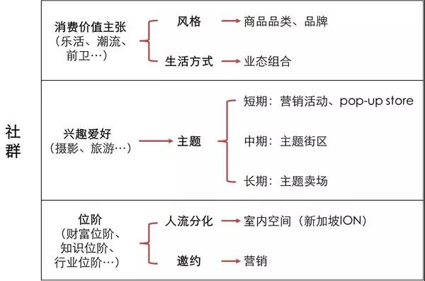 社群的標簽系分為三大類,每一類標簽系都會對賣場的調改與運營決策產生影響:一、消費者價值主張(如樂活、潮流、前衛等),其影響賣場的風格(商品品類、品牌)及生活方式(業態組合);二、興趣愛好(如攝影、旅游、烹飪等),其影響賣場短、中、長期的主題;三、位階(如財富、知識、行業等),其影響賣場的人流分化空間設計與營銷邀約。