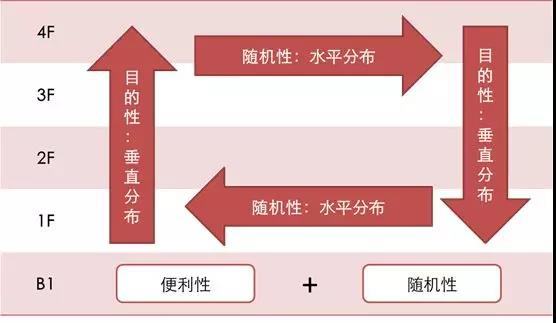 在傳統零售人的觀念里,習慣于以樓層為單位“水平”的觀察一個賣場,并用商品屬性的品類思維來進行空間劃分。但在消費者眼中,賣場不是平的,而是一個立體化的空間。在這個空間內,消費者既會產生“直奔主題”的目的性購買,也會產生“臨時起意”的隨機性購買。因此賣場在調改過程中,需要針對社群-會員-人流這三個不同客層的目的性、隨機性、便利性消費特點,打造“目的性品類垂直分布”、“隨機性品類水平分布”的“垂直閉環”式布局模式。通過這種布局,可以合理的引導客流走向,盤活整個賣場空間。大阪阪急梅田總店的化妝品區域垂直分樓層分布、杭州西湖銀泰城的垂直及水平動線組合,都是這一理論很好的展現。