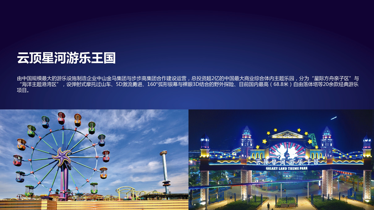 是步步高新天地旗下各旅游類業態,經過全新要素整合,歡樂升級后的典型城市近郊輕度假文旅綜合體。目前涵蓋了中國眾多獨一無二的文化旅游項目:世界最大的航空運動飛行娛樂綜合體—飛行體驗館;中國最大的商業綜合體類主題樂園—云頂星河游樂園……