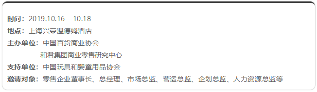 10月16日-18日,中百協2019年度零售研究分享會在上海舉辦,和君集團高級合伙人、和君零售事業部負責人、和奕咨詢創始人丁昀將以豐富主題街區案例,教學主題街區正確的打開方式,期待您的加入。